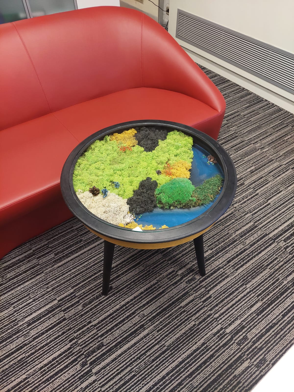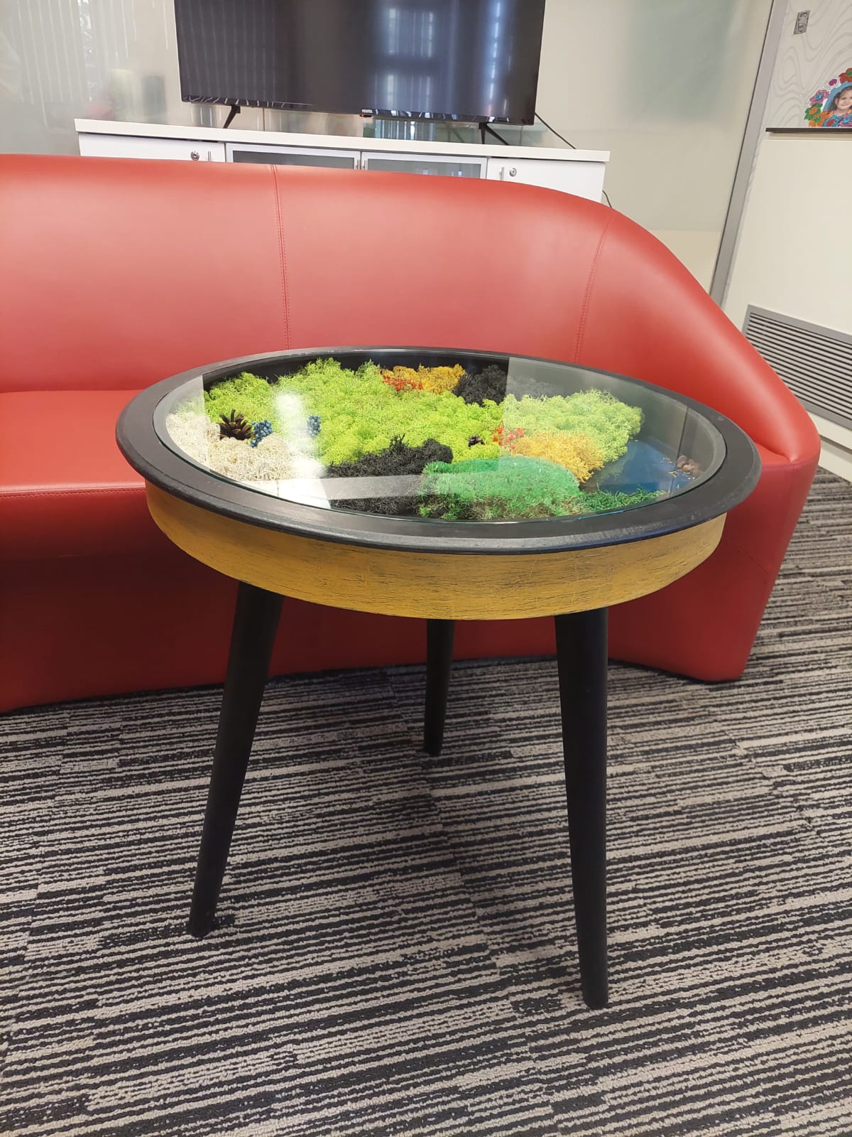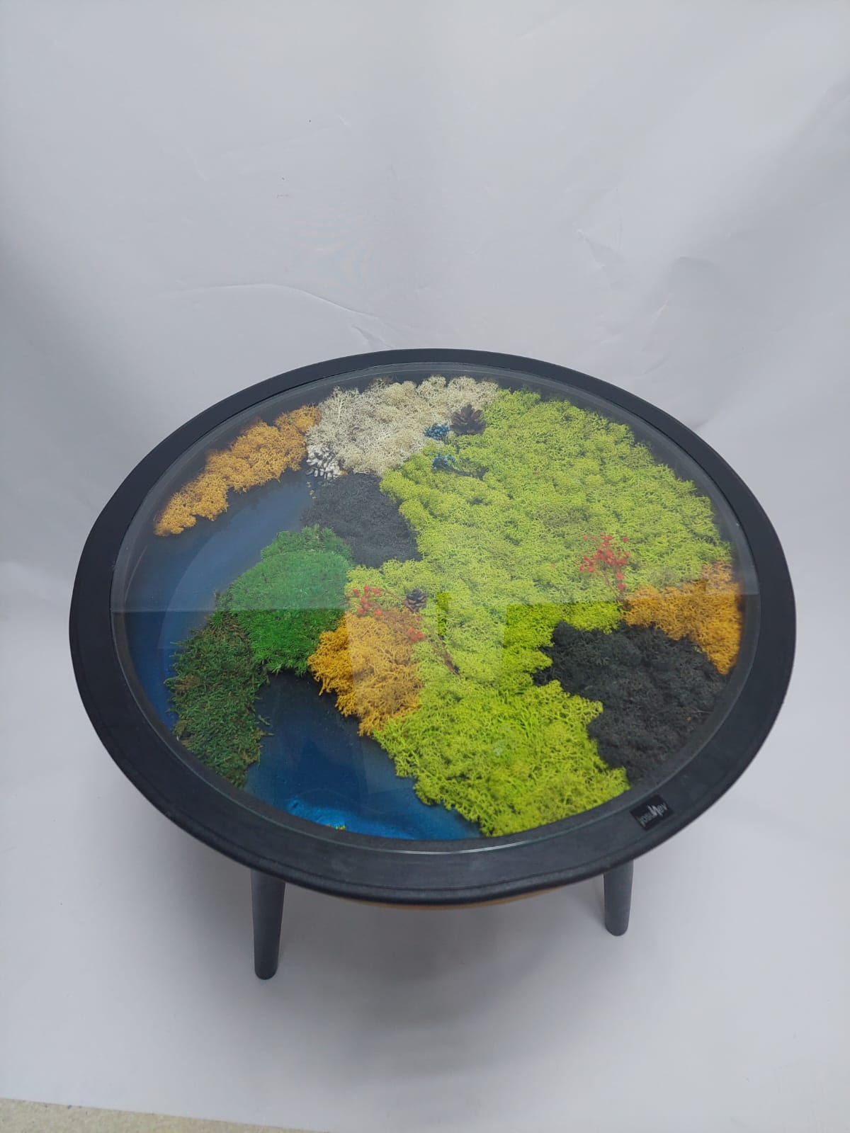 Ø60 cm çap 50 cm yüksekliğinde 3 ayaklı canlı yosun tasarımlı camlı sehpa