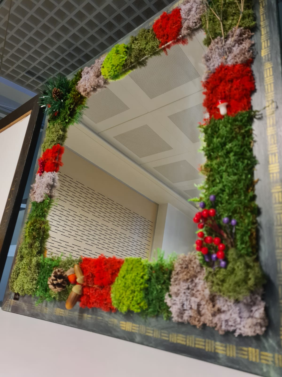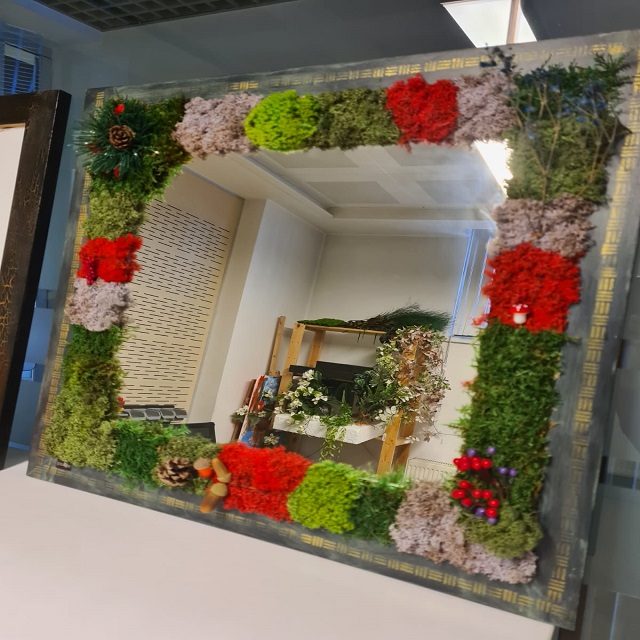 60x60 boyutundadır. Çerçeveler özel efekt baskılıdır. Ayna 45 x 45 ölçülerindedir. Mumyalanmış yosun ile hazırlanan bakim gerektirmeyen %100 doğal malzemelerle yapılmıştır. 2 yıl firma garantilidir. Böceklenme yapmaz ve oksijen salınımı sağlar.