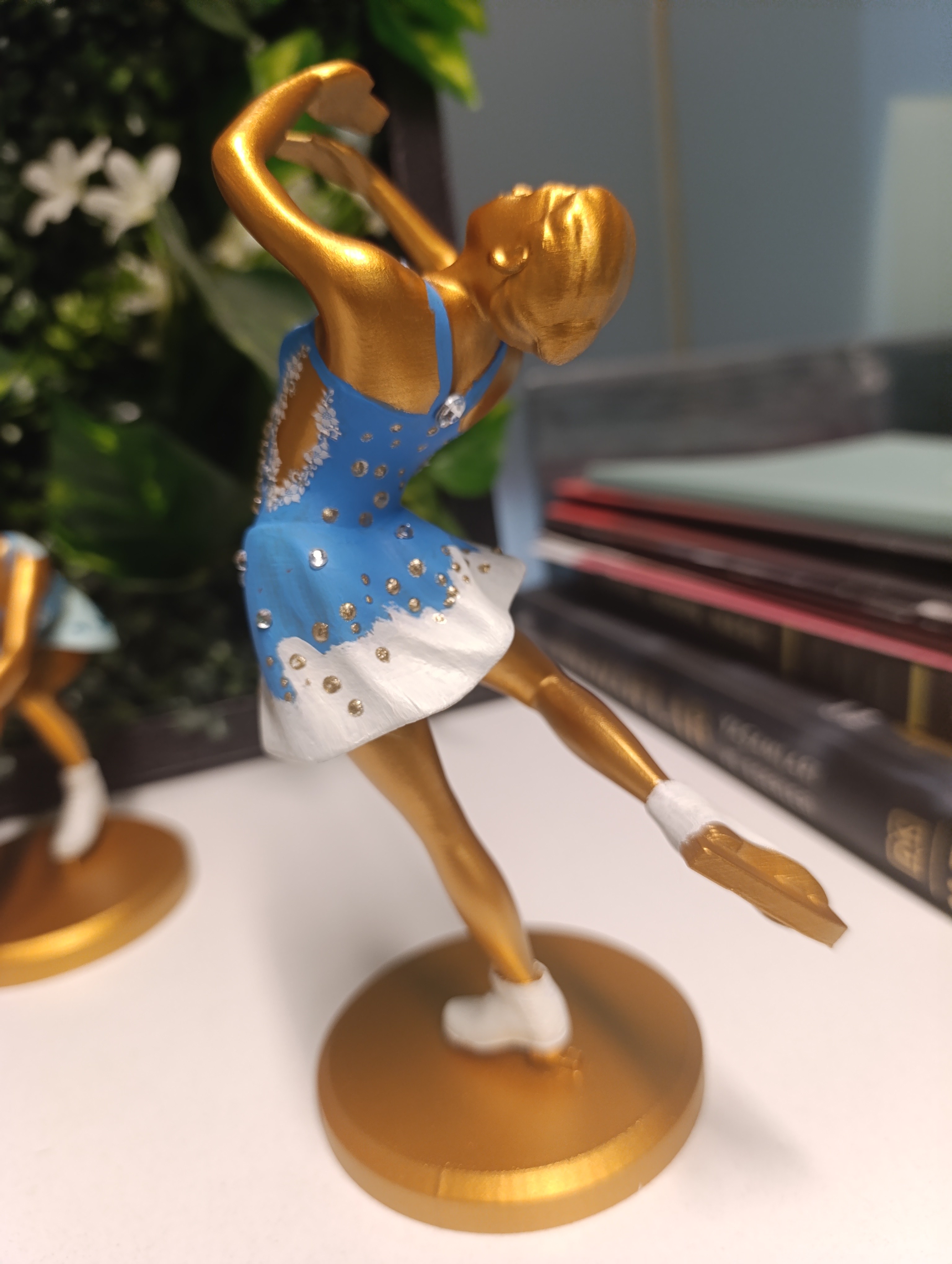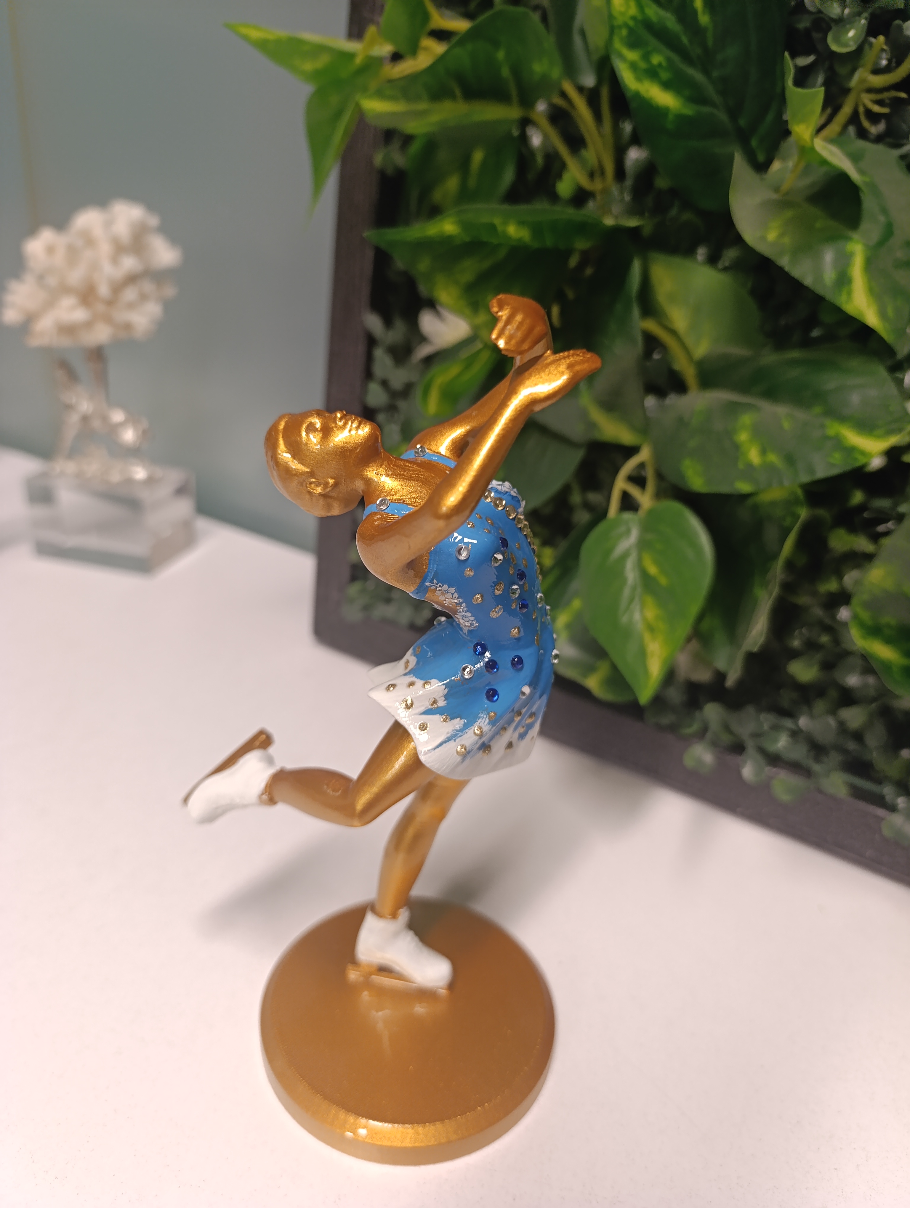 • Gold gövde, Gümüş yaldızlı mavi  elbise, Beyaz paten.